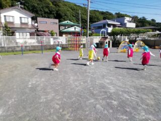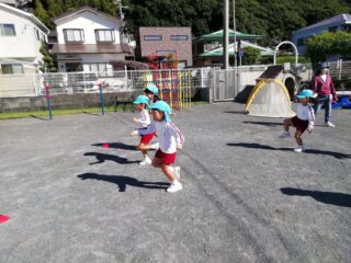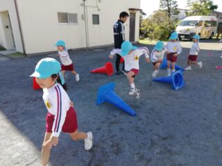 最初は元気よく、ウォーミングアップ!カニさん歩きをしたり、コーンの上をジャンプしたり、「疲れた~」という声も聞こえましたが、最後まで諦めることなく頑張っていました。