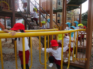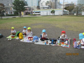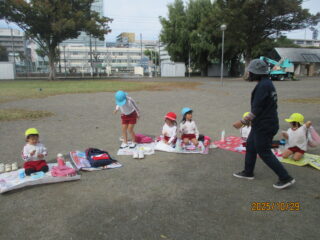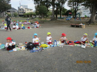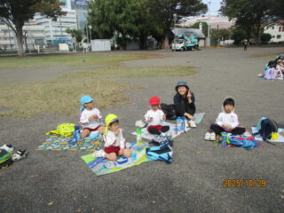 森下公園まで歩くことが初めての年少さん、お兄さん・お姉さんに優しくしてもらいながら、頑張って歩いて行きました。着くまでも楽しそうな話声がたくさん聞こえてきます!