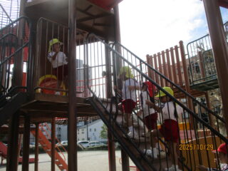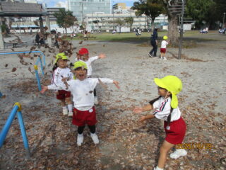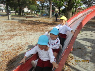 ながーい滑り台を何度も滑ったり、落ち葉で遊んだり、鬼ごっこをしたりと、みんなとっても楽しんでいました。