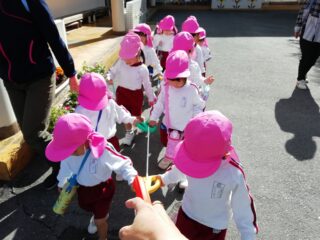 先週、みんなで列になって歩く練習をしていたので、今日は上手に歩いて道路を歩いたり、横断歩道を渡ったりすることができました!