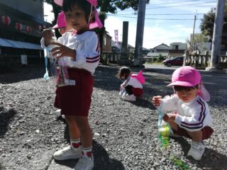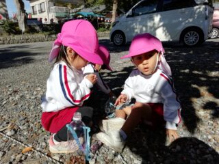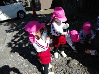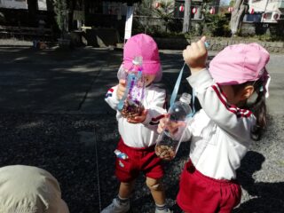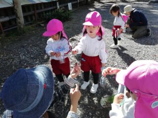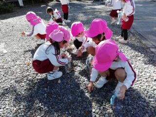 八幡神社に着くとたくさんのどんぐりが落ちていて、みんなで夢中になって拾いました。お友達とどれだけ拾ったか見せ合ったり、バックいっぱいになるまで拾うんだ!と一生懸命拾っていたり、小さい赤ちゃんどんぐりを見つけて嬉しそうに見せてくれたり、それぞれ楽しんで拾うことができました。最後に神社に挨拶をして園まで仲良く帰ってきました!