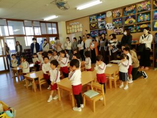 朝の集いでは、聖歌を歌ったりお祈りしたり、名前を呼ばれたら元気よくお返事をしたりしました。お家の方がいらっしゃると嬉しくて甘えたくなる子、興奮気味な子、張り切る子などいましたが、子ども達のありのままの姿を見ていただきました(^^)