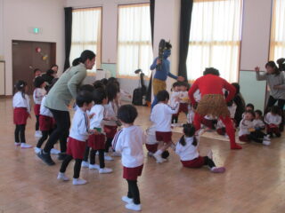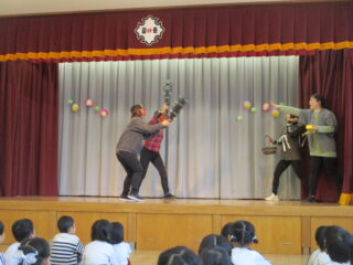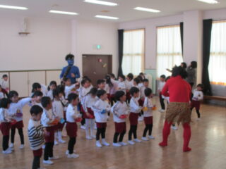 集いでは、みんなで鬼のパンツのダンスをしたり、豆まきの由来の劇を見たりして楽しみました。