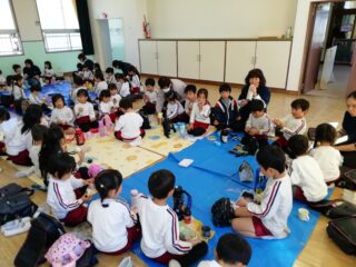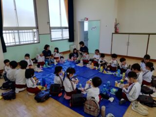 幼稚園に戻ってからは、つぼみさんも合流して、ホールで各グループに分かれておにぎりを食べました★