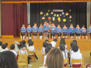 一人ずつクラス、名前、何歳になったかと、年少さんは「好きな食べ物」年中さんは「好きな遊び」年長さんは「保護者の方一言」を言いました。みんな緊張しながらもインタビューに答えていました!